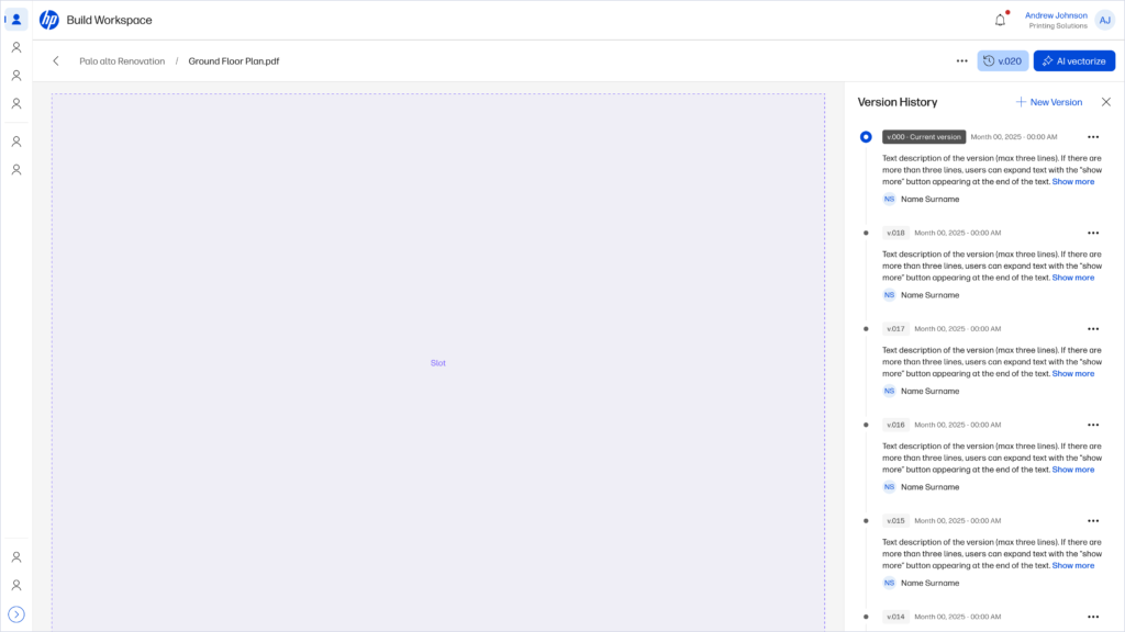 We designed and implemented a Plan Version Control feature for HP Build, a cloud based management platform for constructors and architects (ACs). This feature allows users to upload new versions of drawings, track changes, compare revisions, and approve the latest plan. It reduced errors from outdated documentation and improved collaboration across architects, engineers, and contractors.