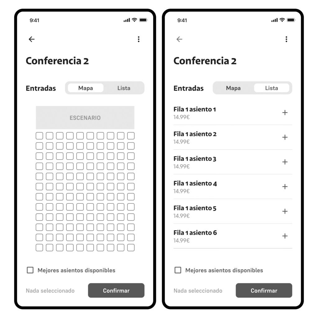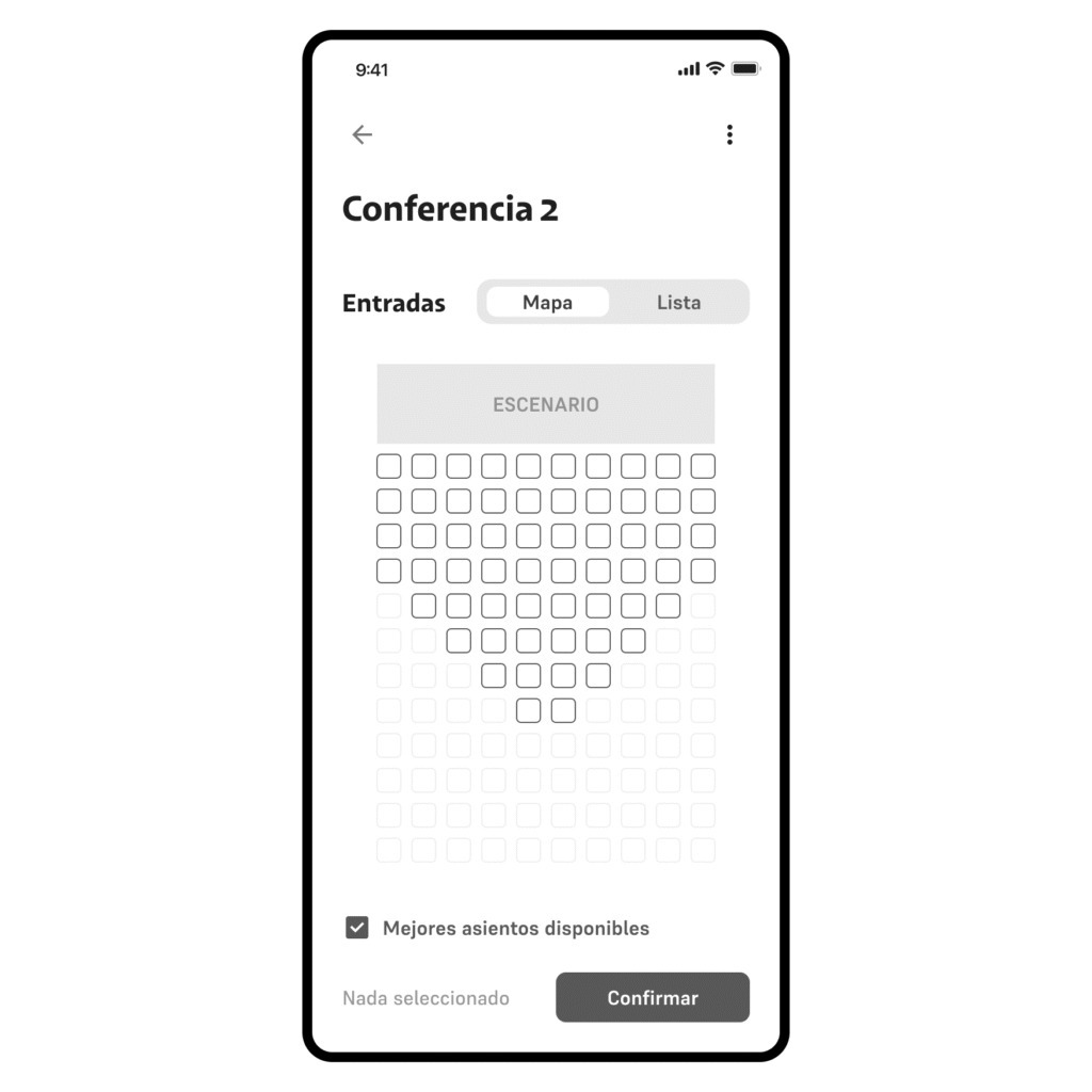 MarĂa, 26 years old, needs to purchase tickets for an important conference from her mobile phone through an app and she is very interested in being able to reserve the best seats in the event room for herself and two friends.