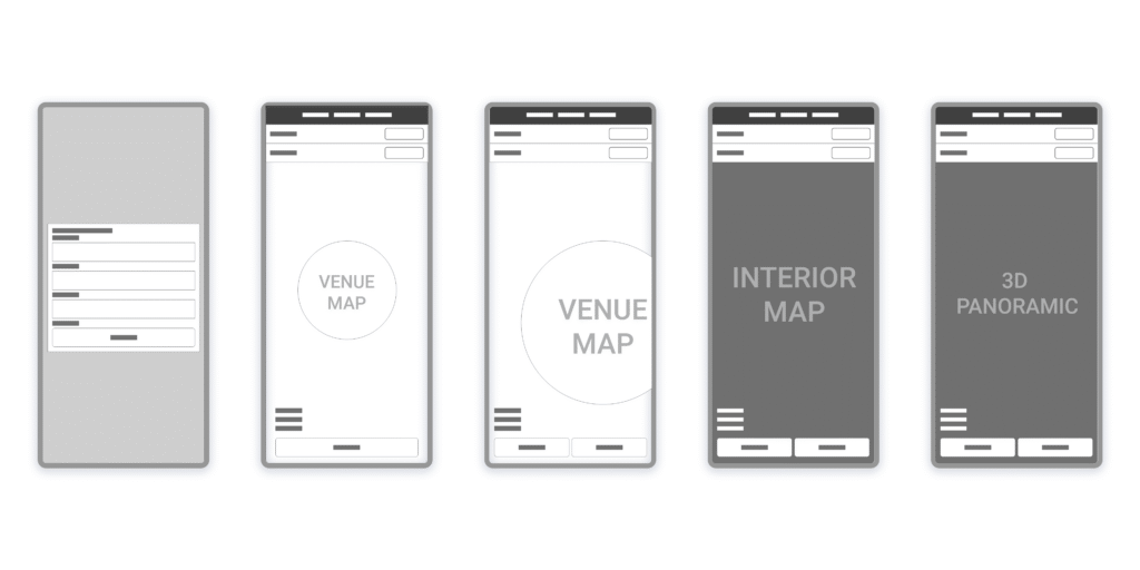 Wi-fi screens with iterations. From left to right: inside map navigation view, 3D view of the chosen seat, and outside map view.